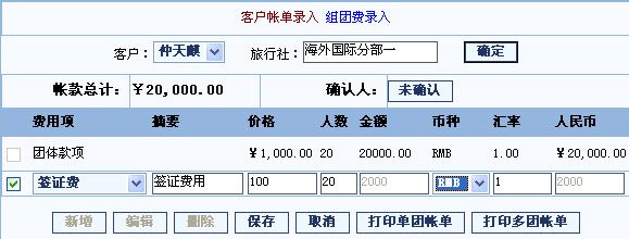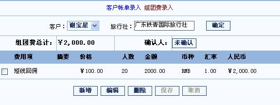 第三步:当客户帐单录入时,首先在上图中选择其中要操作的团号,在下图中点击‘组团费录入’时,然后选择要录入的客户,在旅行社中将会显示此客户所属哪个旅行社,点击‘确定’查询有关此客户的费用项信息(此处费用项是指左边导航栏中的“”中的费用项),可以对费用项进行添加,编辑,删除等操作,最后点击‘保存’,客户费用项操作成功。