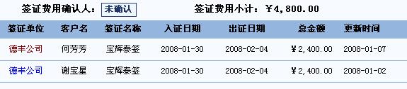 第三步:添加签证信息后,将签证情况显示在下方,如下图所示;如果要修改签证信息,在下图中点击‘签证单位’链接按钮,然后在上图中修改对应的签证信息,修改完后点击‘保存’,结果重新显示在下图中。 |