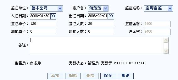第二步:添加旅游团签证情况,首先在上图中选择其中要操作的团号,在下图中输入信息然后点击‘保存’,添加签证情况。 |