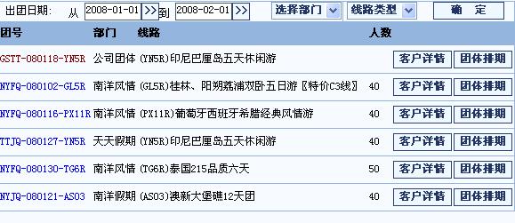 第一步:单击左边导航栏中‘团体作业’下的‘签证作业’,进入签证作业页面(如下图),可按出团日期,部门,线路类型查询满足条件的团体信息。 |