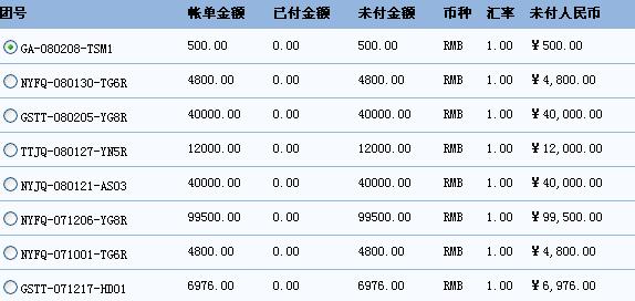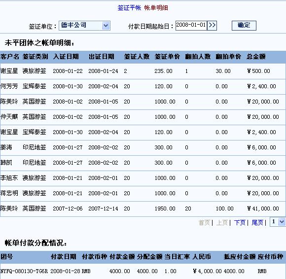 第二步:点击‘帐单明细’链接按钮,选择签证单位,付款日期条件查询出还没有进行团体平帐的客户签证信息,如果有些团体签证已经付款,则下面会显示帐单付款分配情况。