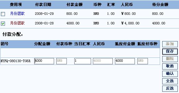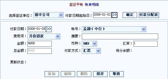 第三步:上述操作只是对签证信息的操作和查询功能,并没有真正对签证情况进行平帐,添加签证平帐信息时,会在下面显示费用项列表,点击费用项列表中的某一款项,然后点击‘添加’,输入分配金额,最后点击‘保存’,这时签证平帐成功。